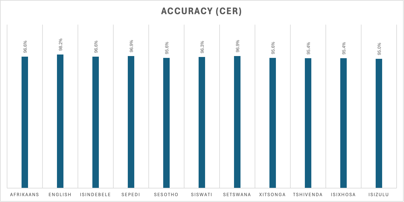 One of the challenges of the vernacular languages of South Africa is the complex grammar and compounding of words that aren’t as prevalent in European languages. Measures such as Word Error Rate (WER) while great for languages like English, don’t necessarily accurately reflect transcription accuracy in Bantu languages or Afrikaans.
