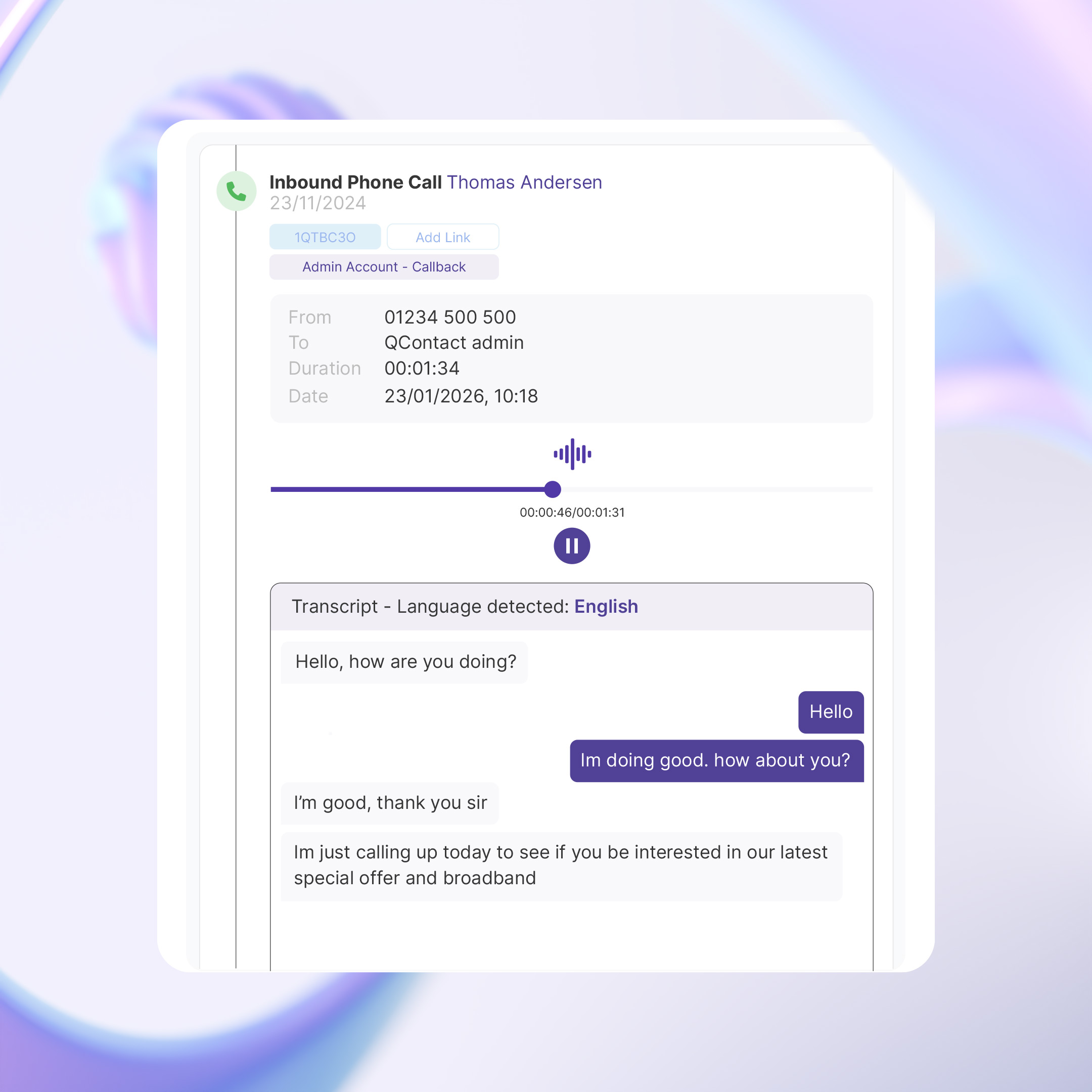QContact includes built in transcription as standard for all your calls. Covering over 30 languages, we provide the most accurate transcription in the market.